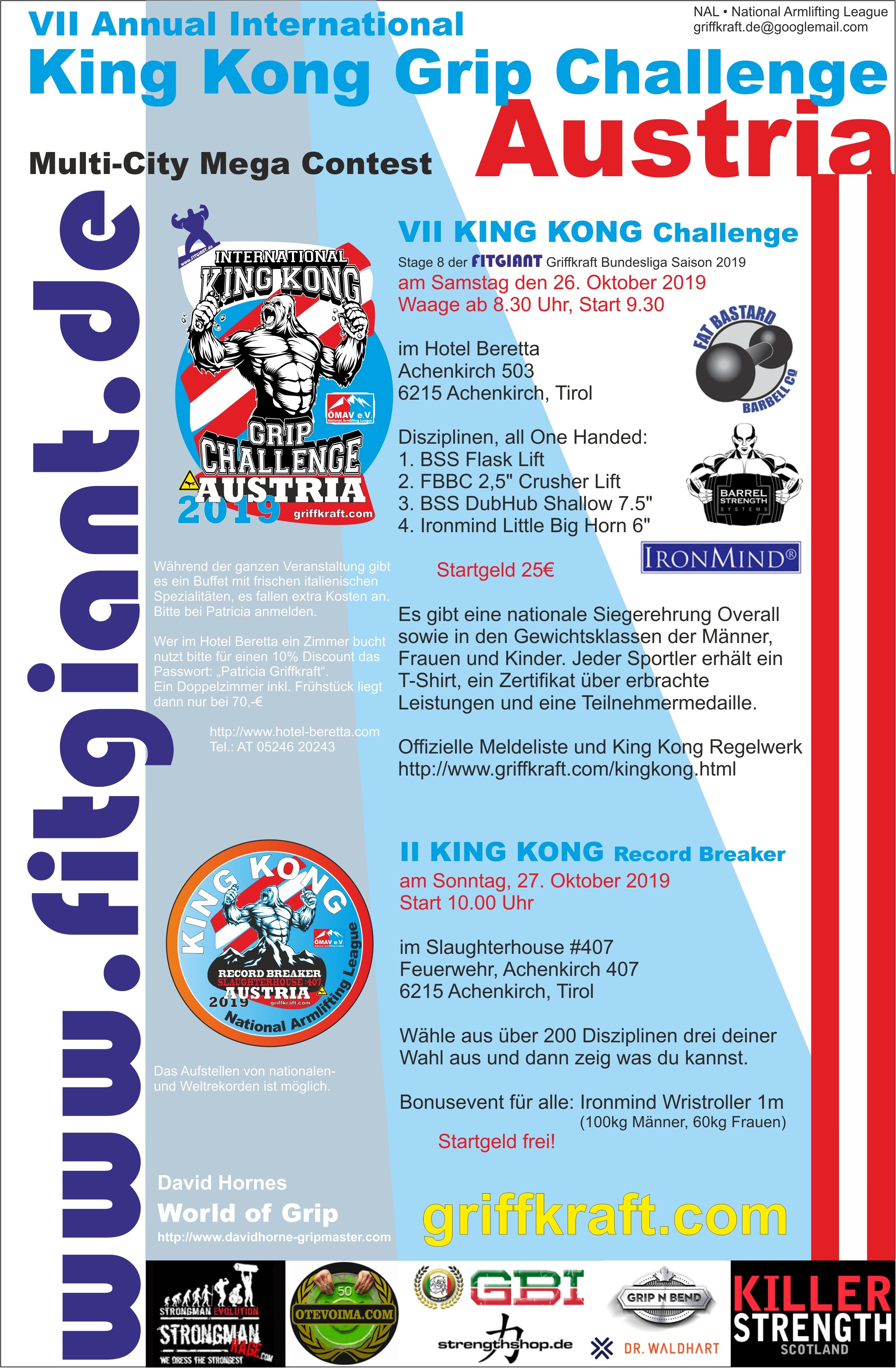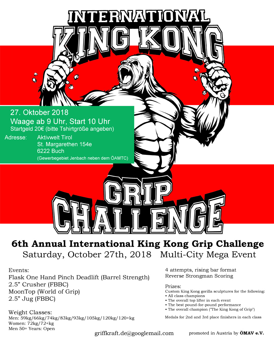 Herzlichen Glückwunsch an alle Teilnehmerinnen und Teilnehmer, und einen ganz besonderen Glückwunsch an Patsy Luxner, die "The Queen Kong of Grip" geworden ist, und an Tanner Merkle, der erst die zweite Person iist, die in den vergangenen Jahren mehrmals zum "King Kong of Grip" erklärt wurde!